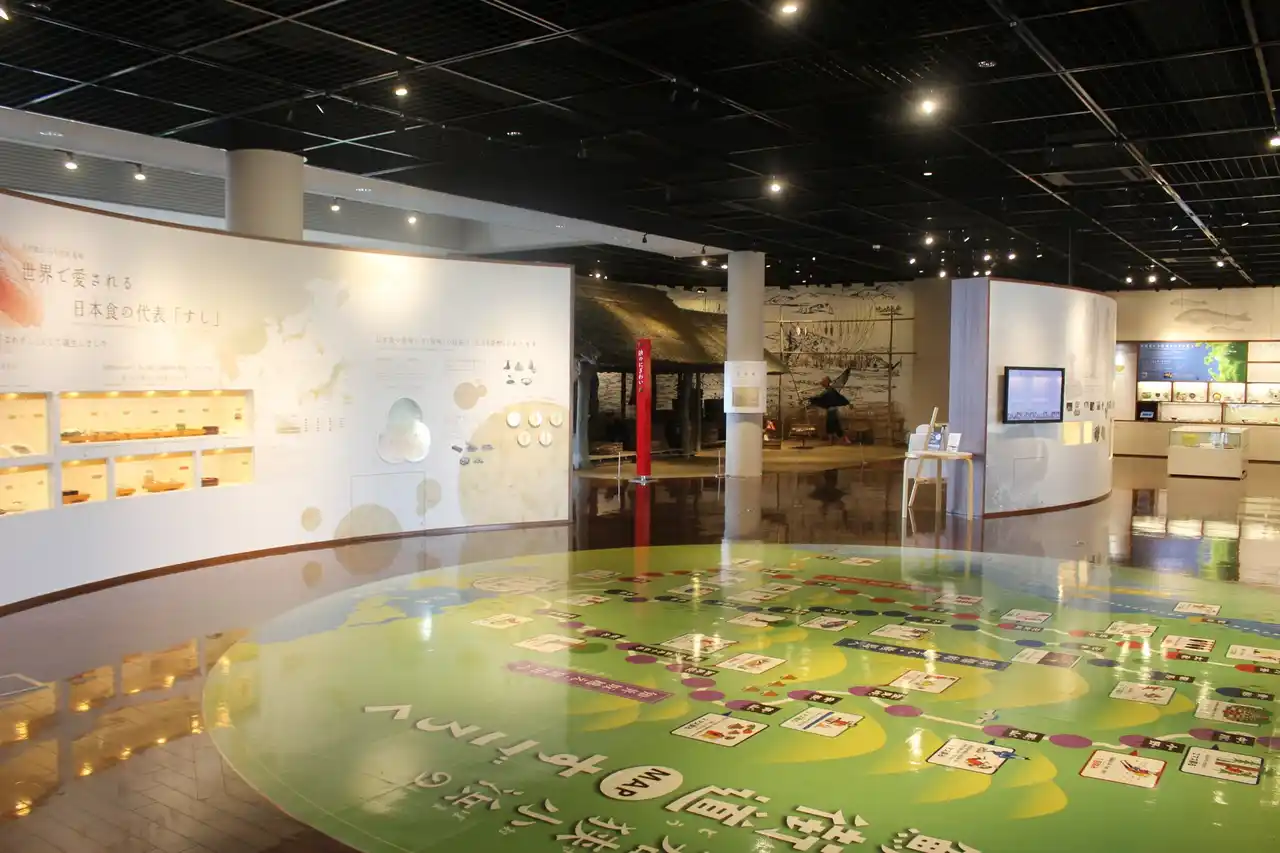 御食国若狭おばま食文化館ミュージアム内。鯖街道MAPすごろくなど、楽しみながら食文化を学べる展示が広がる。 |