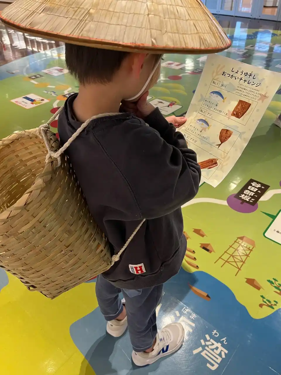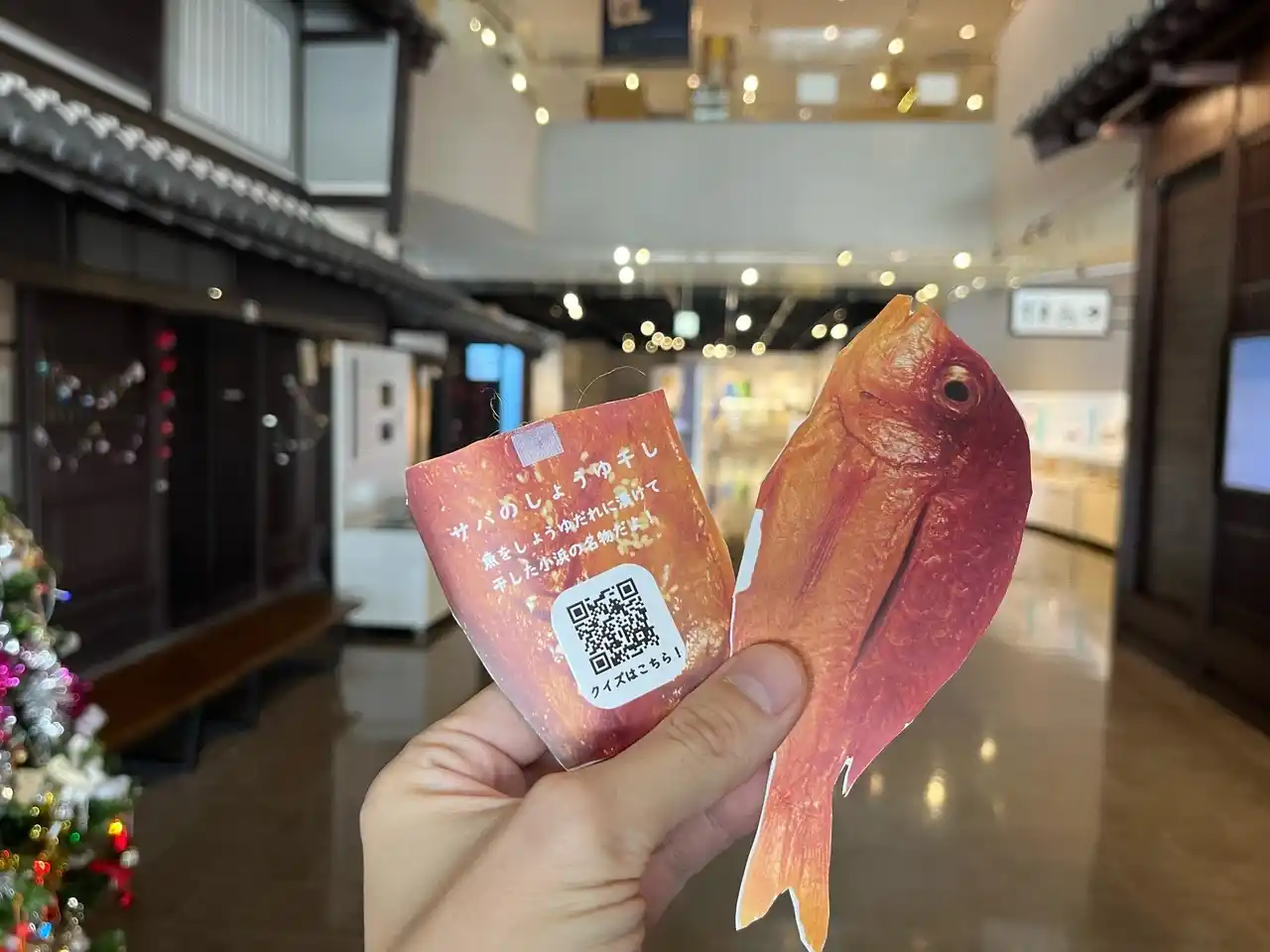 親子で楽しめる!館内に吊るされた干物カードの中から、お題となる魚を探し出す体験型ゲームです。行商人風の衣装を身にまとっての記念撮影も楽しめる、子どもから大人まで参加可能な参加型コンテンツです。 |