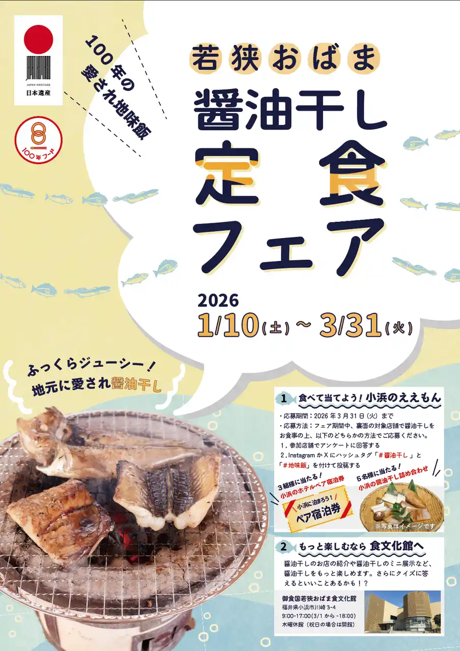 小浜市・若狭町日本遺産推進協議会と一般社団法人若狭おばま観光協会は、この地域に根付く伝統食に改めて光を当てるため、「ひものの日」である令和8年1月10日(土)から3月31日(火)まで、小浜市内の飲食店8店舗にて「100年の愛され地味飯 若狭おばま醤油干し定食フェア」を開催します。 |