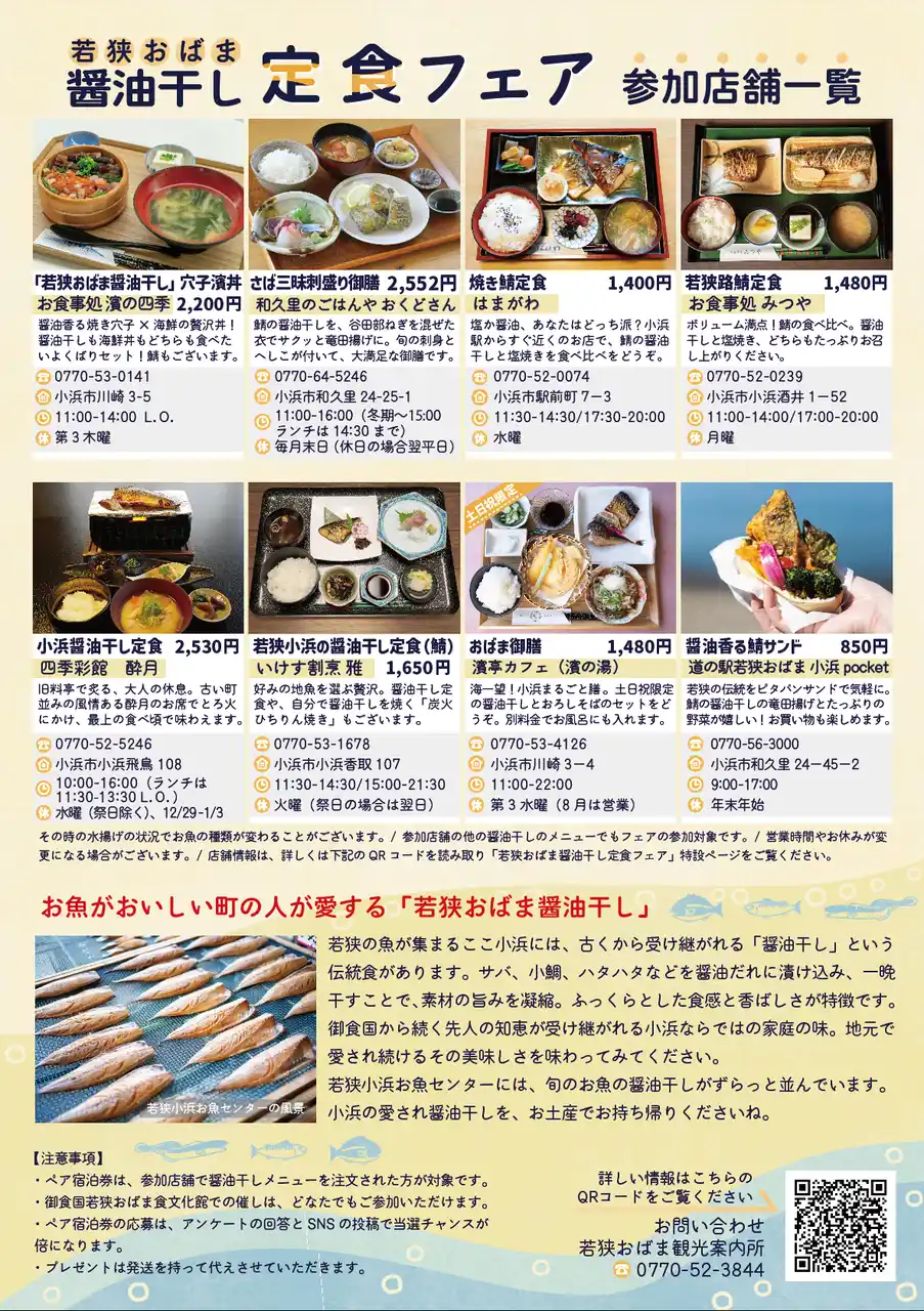 本フェアでは、文化庁の「100年フード」にも認定された「若狭おばま醤油干し」を主役に、各店舗が趣向を凝らした定食を提供。観光客には“地元で本当に食べられてきた日常の味”を、地域住民には“改めて価値を見つめ直す機会”を届けることで、食文化を軸とした観光と地域消費の活性化を目指します。 |