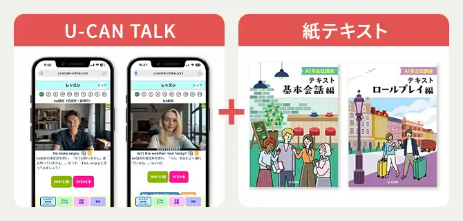 (2) AI講師+テキストの相乗効果でやさしく上達! ------------------------------------------------------------------- 当講座はわかりやすい紙のテキスト付きなので、「英会話は初心者レベル。英語で答えられないかも……」といった方も安心です。テキストで学んでから「U-CAN TALK」のAI講師とレッスンすることで、日常から、旅行、ビジネスまで幅広く役立つ英会話力を効率良く養成します。 ※テキスト学習は省略し、「U-CAN TALK」の会話レッスンのみ取り組むことも可能です。 |