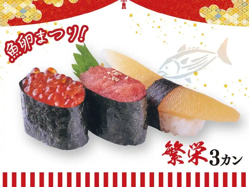 家族の健康と幸せを願う「繁栄」は、食感も楽しめる3カンです。(いくら軍艦、明太子軍艦、数の子) |