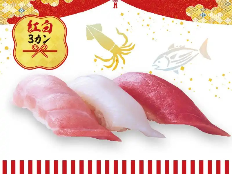 新年にふさわしい紅白の握り。年迎えの席を彩る華やかな3カンです。(本まぐろ大とろ、いか、本まぐろ上赤身) |