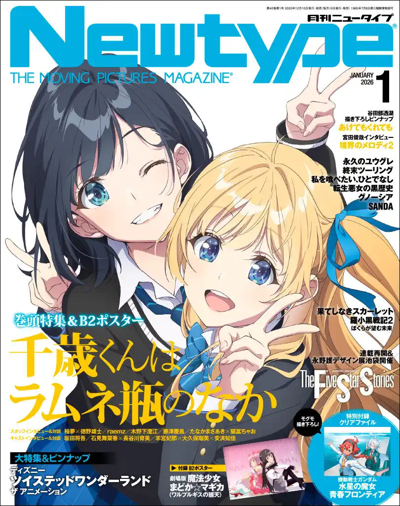 | 『機動戦士ガンダム 水星の魔女』キャラクターデザイン原案を手がけたモグモが『機動戦士ガンダム 水星の魔女 青春フロンティア』のスレッタとミオリネを描き下ろしたクリアファイルが付録の『月刊ニュータイプ』’26年1月号も好評発売中です。 | |||||||||||||||||