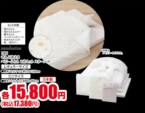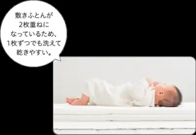 セット内容がすべて洗える(※)、日本製にこだわったふとんセット!お洗たくの手間を軽減する防水キルトパッド入り。 |