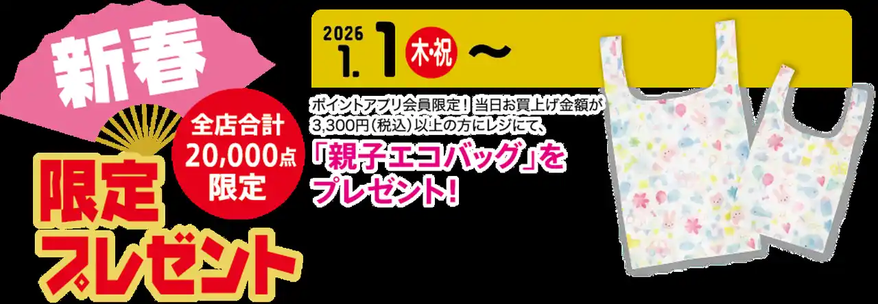 当日お買上げ金額が3,300円(税込)以上の方にレジにて、「親子エコバッグ」をプレゼントします! |