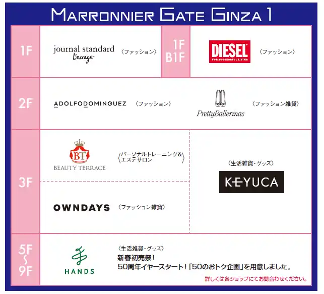 施設概要■□■━━━━━━━━━━━━━━━━━━━━━━━━―…‥・・ 【名 称】 マロニエゲート銀座1 【住 所】 〒104-0061 東京都中央区銀座2-2-14 【H P】 https://www.marronniergate.com/ 【営業時間】 B1~9Fフロア 11:00~21:00 10~12Fレストランフロア 11:00~23:00 ※年末年始の営業時間 12月31日(水) B1~9Fフロア 11:00~18:00 10~12Fレストランフロア 11:00~21:00 1月1日(木・祝) 休館日 1月2日(金)、3日(土) |