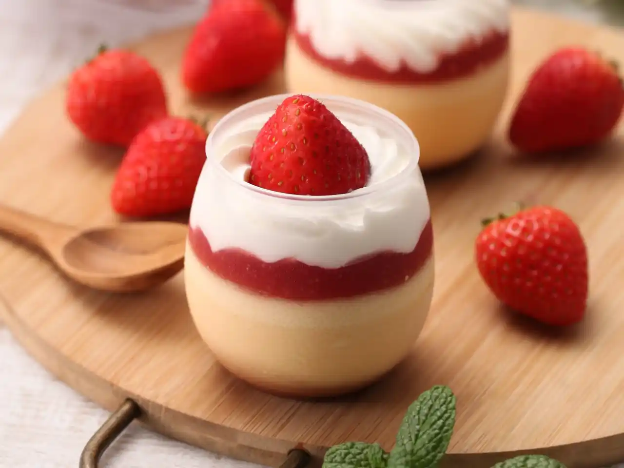 とろける口どけのなめらかプリンと、ほろ苦いカラメルソース。さらにその上に甘酸っぱいいちごソースと、濃厚な生クリームをたっぷり重ねました。仕上げに、大粒でフレッシュな「べにたま」を飾りました。 |