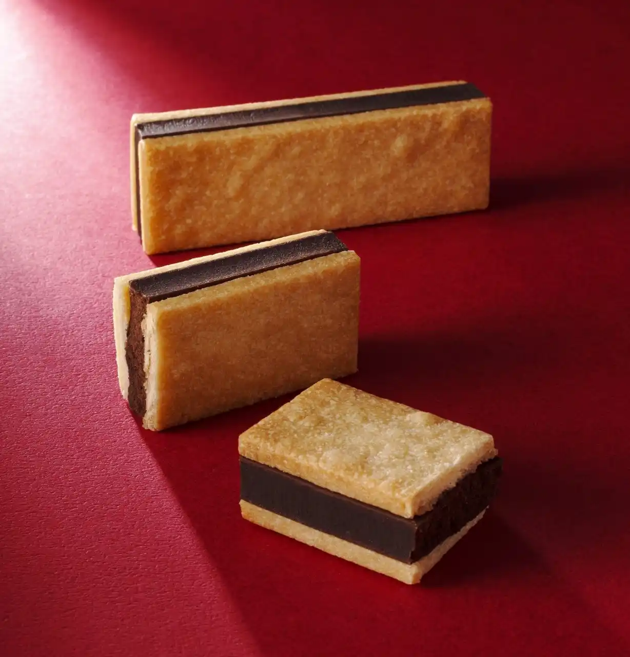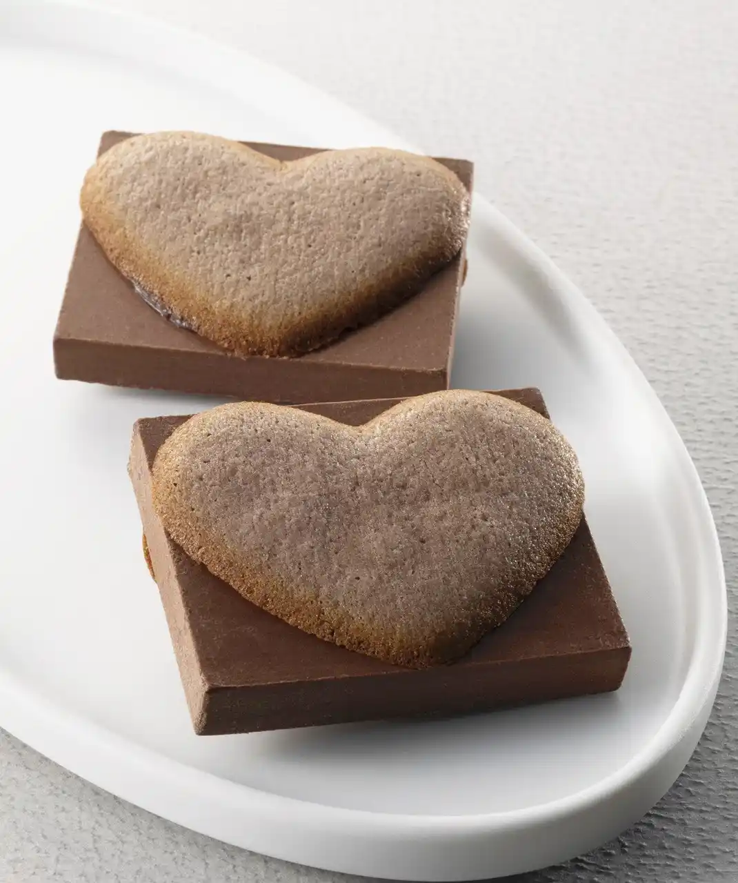 発酵バターとチョコを配合したハート型生地で、厚みのあるスクエアチョコレートをサンド。 |
