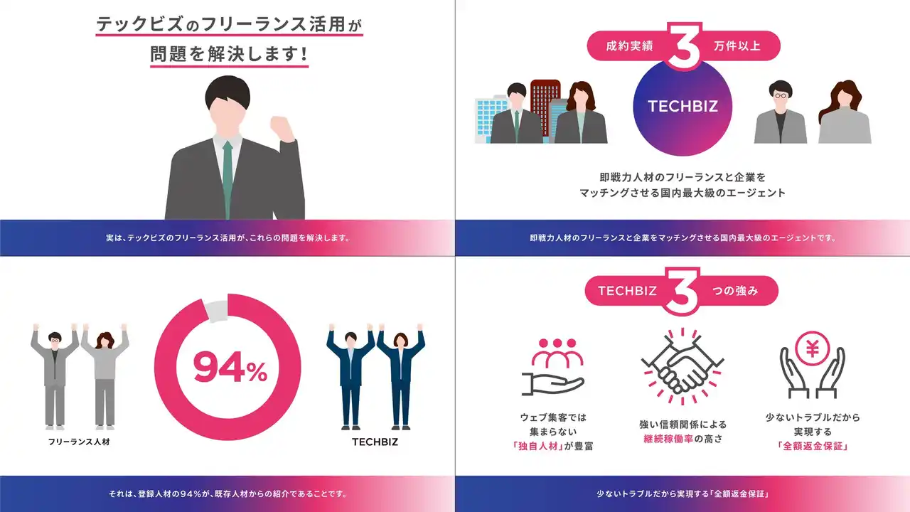 企業の人手不足が深刻化する中、採用現場では即戦力人材の不足、スキルミスマッチ、トラブル時のサポート不足など、複合的な課題が浮き彫りになっています。こうした状況を受け、テックビズでは、人材確保の課題に直面する企業に向けて、フリーランス活用という選択肢や当社サービスへの理解を深めていただくための映像コンテンツを制作いたしました。 |