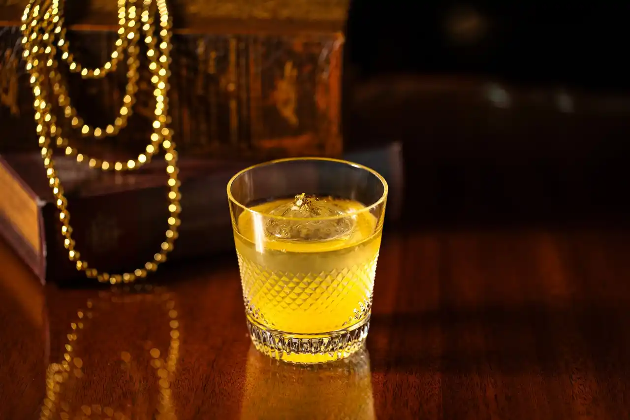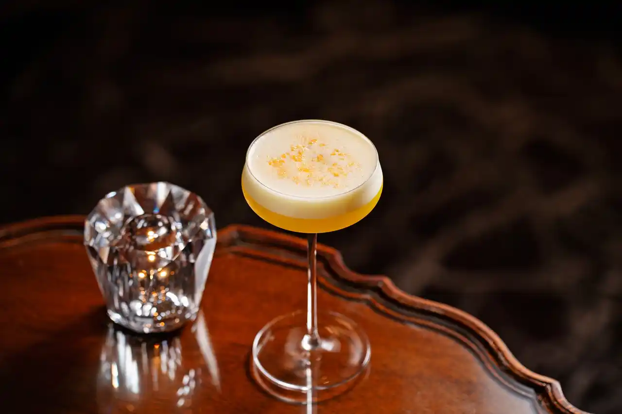 「接吻(恋人たち)」に着想を得た一杯。宗教美術の技法を駆使し、人間の結びつきを讃えたクリムトの精神に想いを馳せ、カクテルと人との繋がりをこの一杯に表現しました。泡盛「ZANPA 島バナナ酵母 25度」にパイナップルのジューシーな果実味と、シャルトリューズの繊細なハーブのニュアンスが織り成すハーモニー。グラスを傾けるたび煌めくパールパウダーが華やぎを添えます。 |
