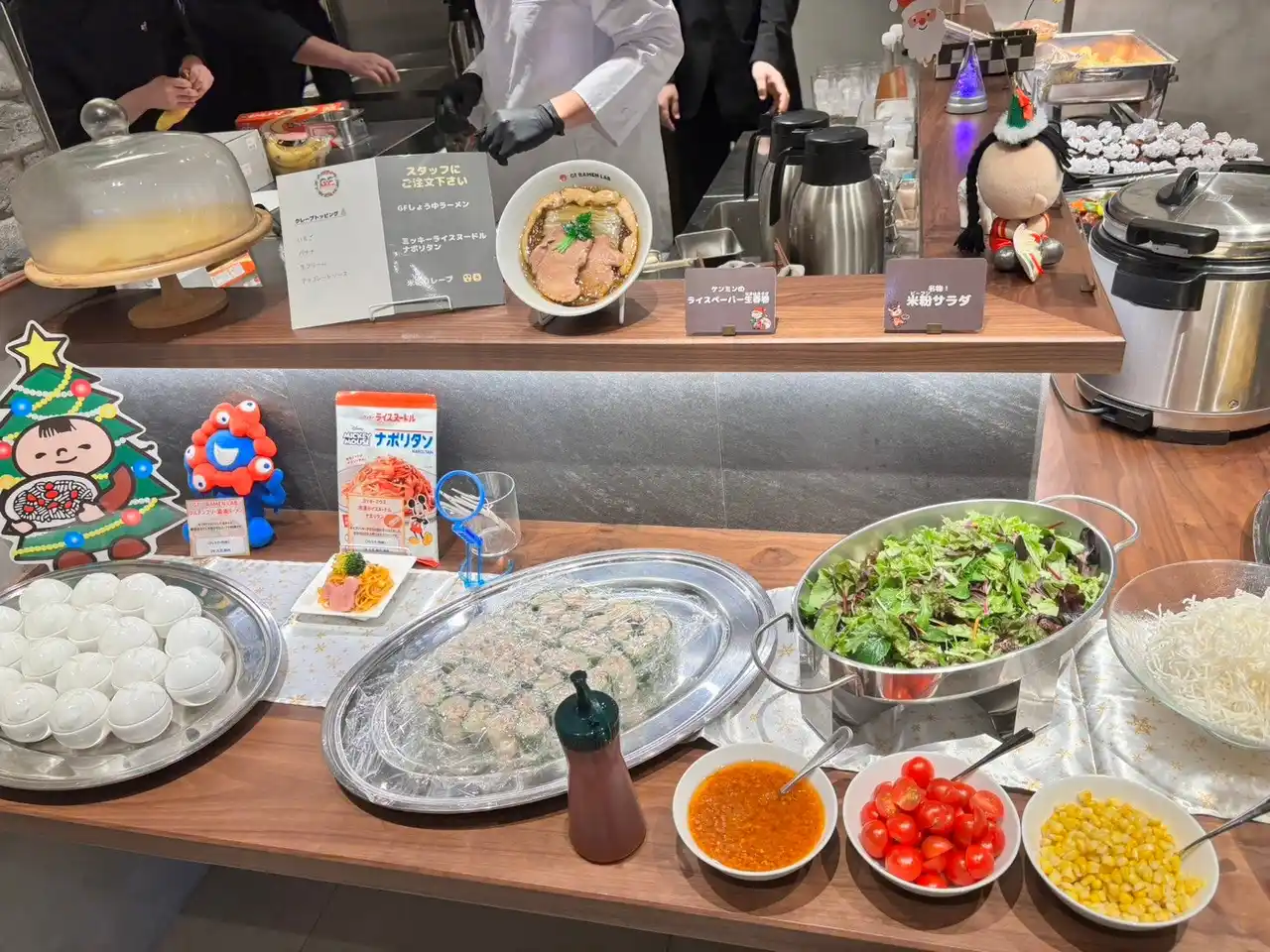手羽先のローストチキンといったクリスマスらしいメニューや目の前で作るところを見ることができる米粉クレープの他、大阪・関西万博で大きな話題を呼んだ「GF RAMEN LAB」 で大人気だった「GFしょうゆラーメン」もご提供。“万博の味”としてご好評を頂きました。 |