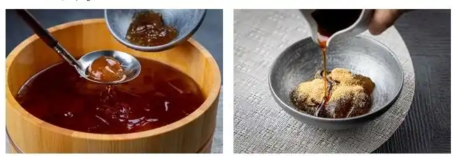 自家製わらび餅には、きな粉、黒蜜タレ、みたらしタレからお好きなものをお選びいただき、かけてお召し上がりいただきます。 |