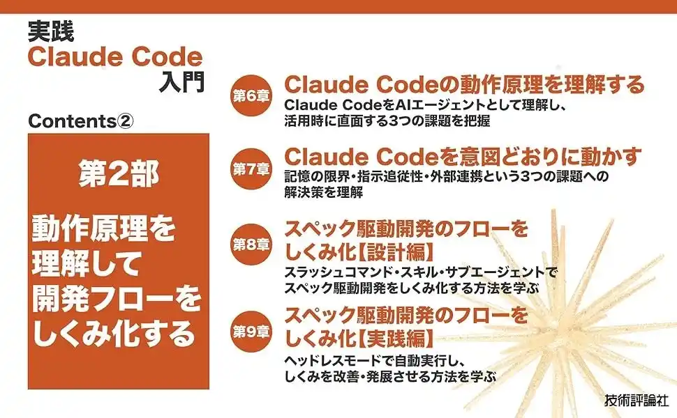 第2部ではAIエージェントとしてのClaude Codeの動作原理を理解し、意図通りに動かすための問題切り分け方法や、スラッシュコマンド・スキルの設計方法を解説しています。 |