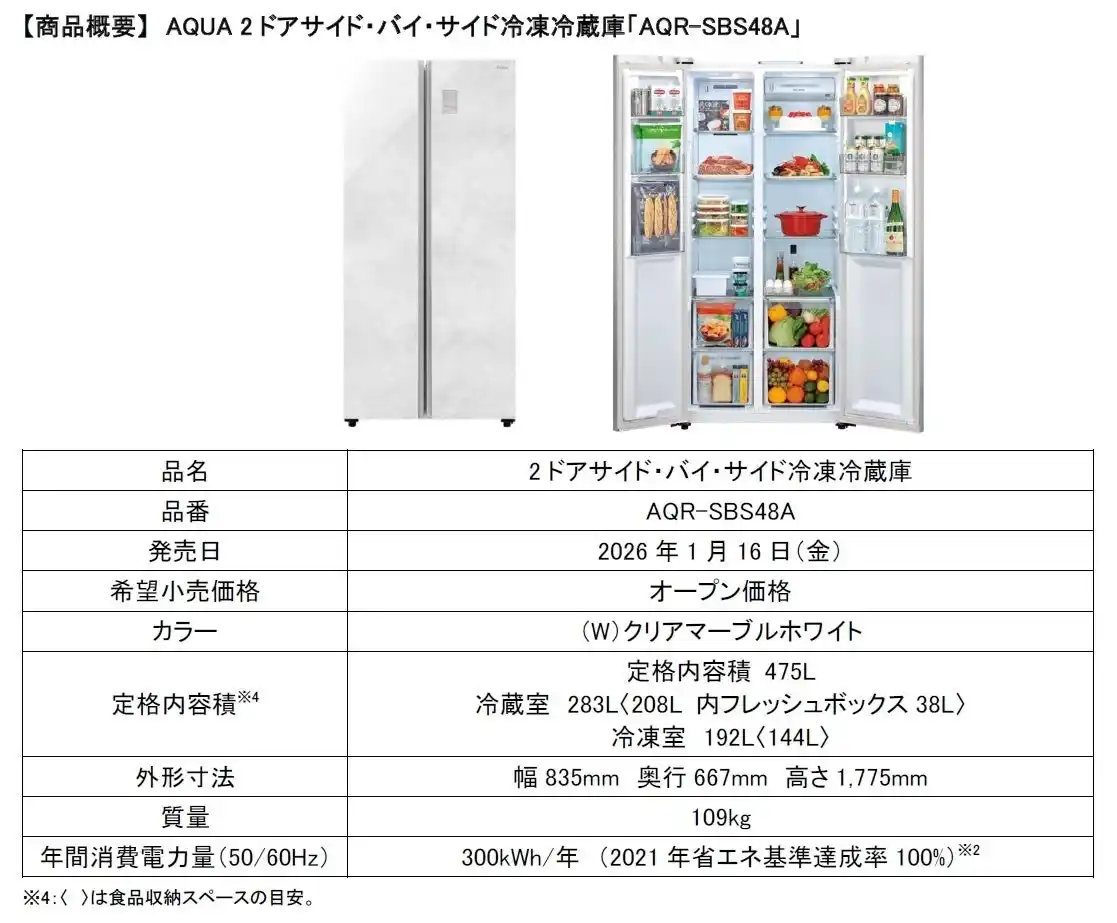 アクア株式会社(本社:東京都中央区、代表取締役社長 兼 CEO:杜 鏡国)は、庫内を縦に2分割し右に冷蔵室、左に冷凍室を配置した、シンプルかつダイナミックなレイアウトが特長のSide by Side(サイド・バイ・サイド)スタイルの2ドア冷凍冷蔵庫「AQR-SBS48A」を、2026年1月16日(金)に発売いたします。 |