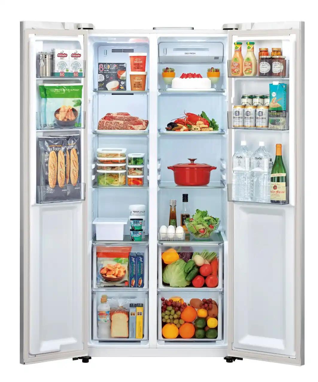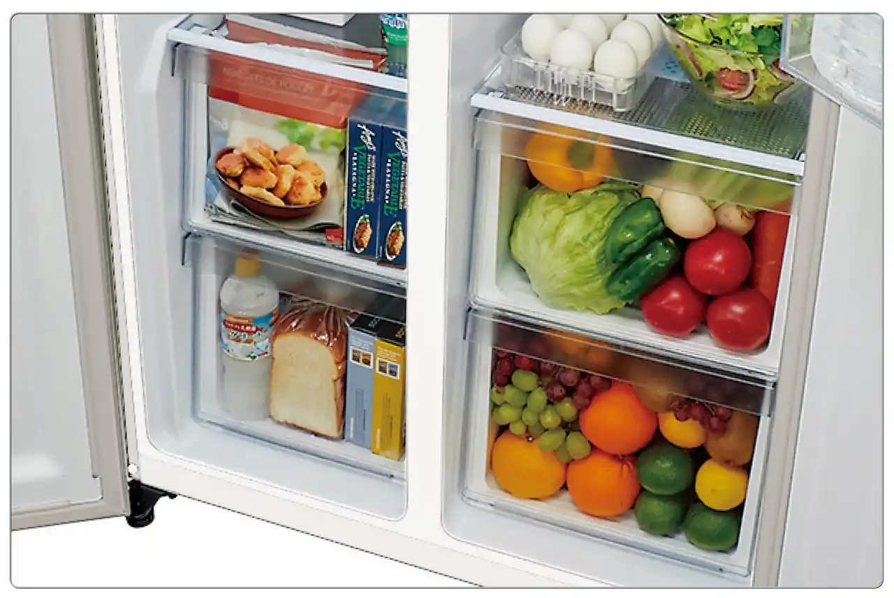 Side by Sideは、特に欧米では定番のスタイルで、庫内を縦に2分割し右側に冷蔵室、左側に冷凍室を配置した、シンプルかつダイナミックなレイアウトが特長の冷蔵庫です。扉は全面フレンチドアで中央から左右に開くので、ワンアクションで庫内を上から下まで一気に見渡すことができます。薄型設計(庫内奥行約51cm)のため最上段の奥まで手が届きやすく、ドアを開けても省スペースで、キッチンにすっきり収まります。 |