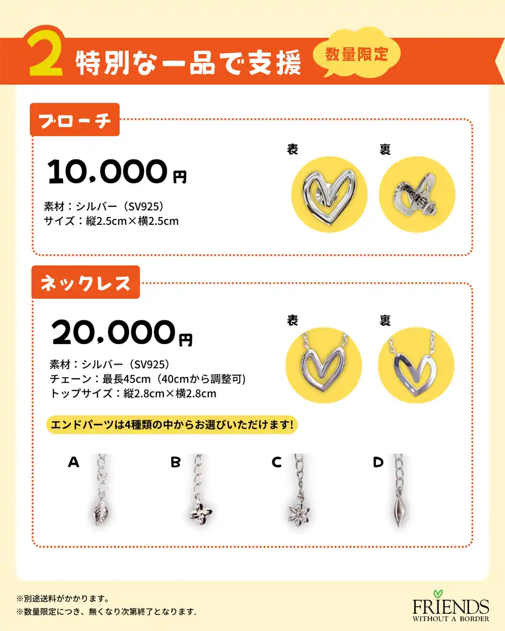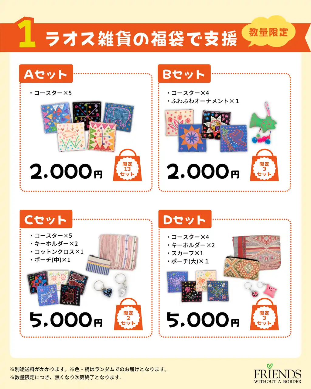 今年は、フレンズのロゴマークである「緑のハート」をかたどったオリジナルピンブローチとネックレスに加え、ラオスの手刺繡コースターやキーホルダー等がギュッと詰まった「福袋」をご用意しました。商品をご購入いただくと、その代金がLFHCで治療を受ける子どもたちへの医療支援となります。 |