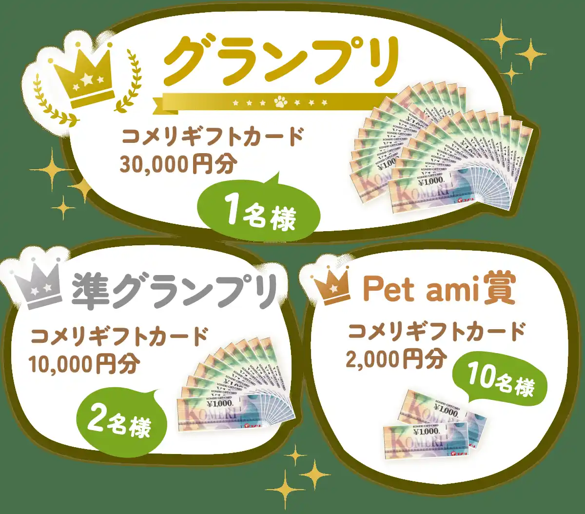 | 今回のコンテストでは、コメリのオリジナルペットブランド Pet ami(ペットアミ)の商品と、みなさんのおうちのペットがかわいく写っている写真を募集します!かわいい”わんちゃん”や”ねこちゃん”などペットたちとの最高の一枚をお待ちしております。 | ||||||||||||||||||