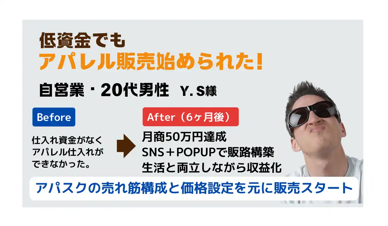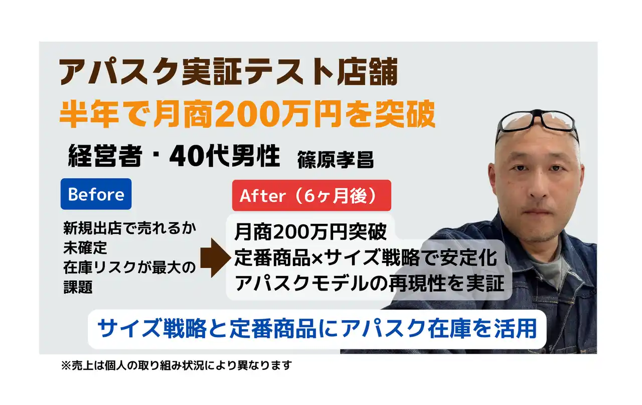 創業者自身も若い頃、仕入れの失敗で何度も苦しい思いをしました。 「売れ残りがゼロになる仕組みさえあれば、もっと多くの若者がアパレルを仕事にできるのに」という強い課題意識がアパスク誕生の原点です。 |