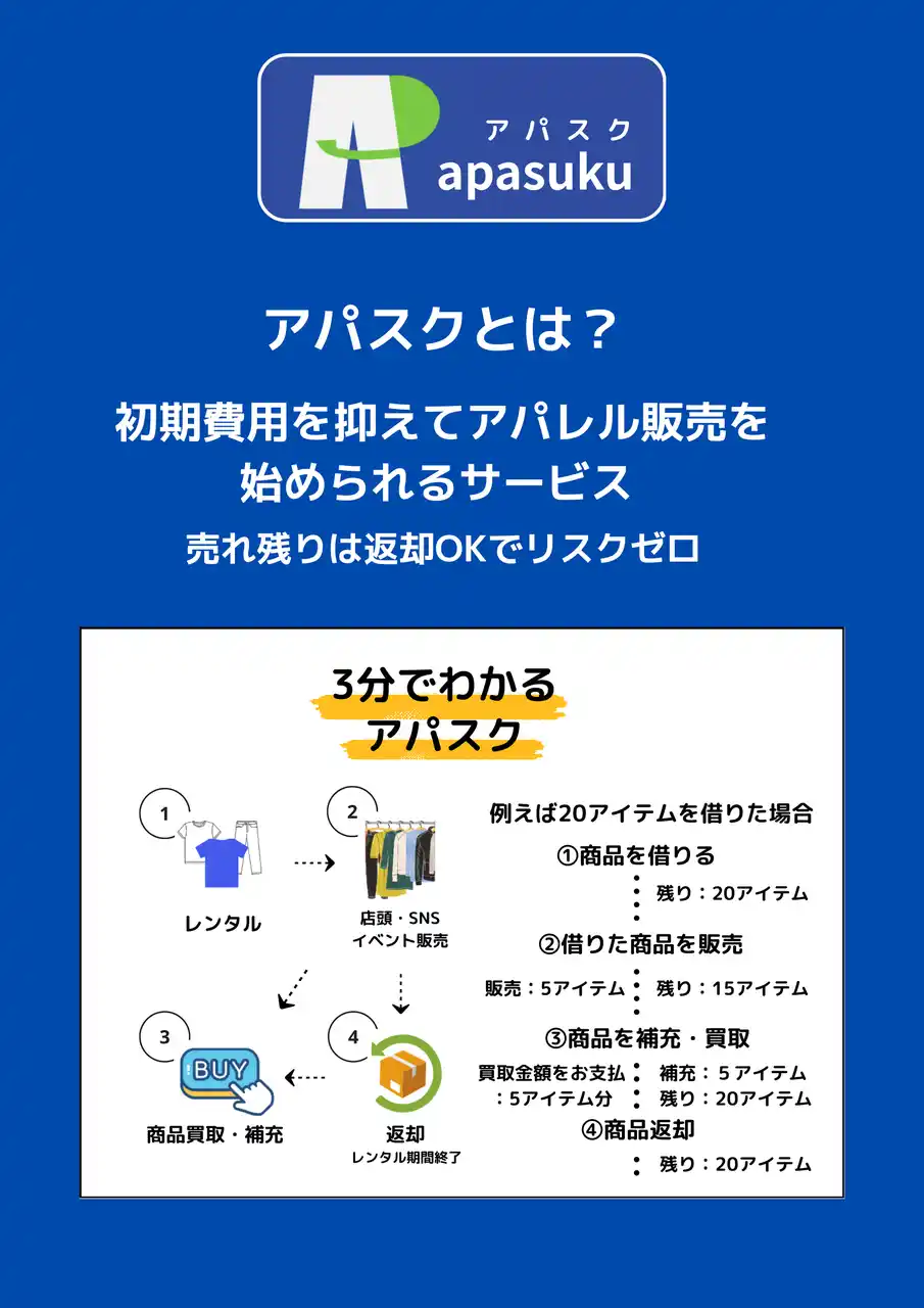 そこでアパスクは、 仕入れを“購入”から“レンタル”へと転換し、在庫リスクを完全にゼロにする まったく新しいアパレル販売モデルを開発しました。 |