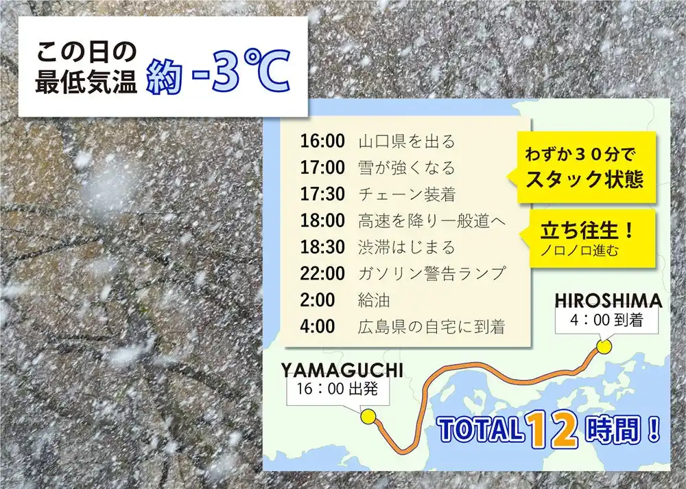 山陽地方の広島県でさえ、スタッフが体験したような急転直下の大雪が起こりえます。路上で身動きが取れなくなったとき、備えがあれば無理に車外に出なくても済み、遭難や事故のリスクを減らすことができます。 |