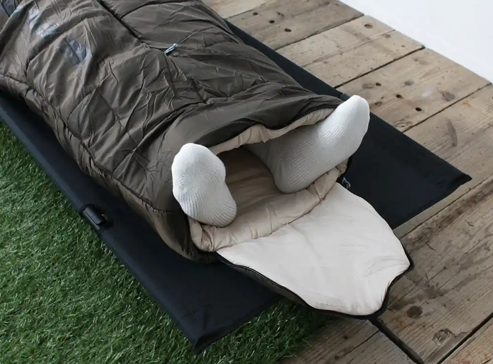 従来の寝袋より足回りを広めに確保。足を自由に動かせて窮屈さを感じにくい設計にしています。 |