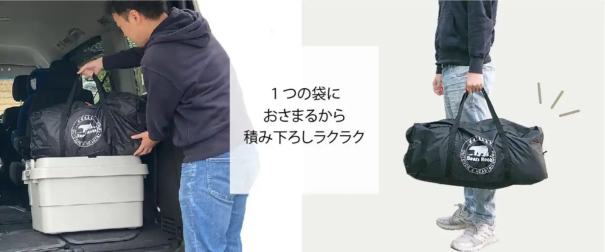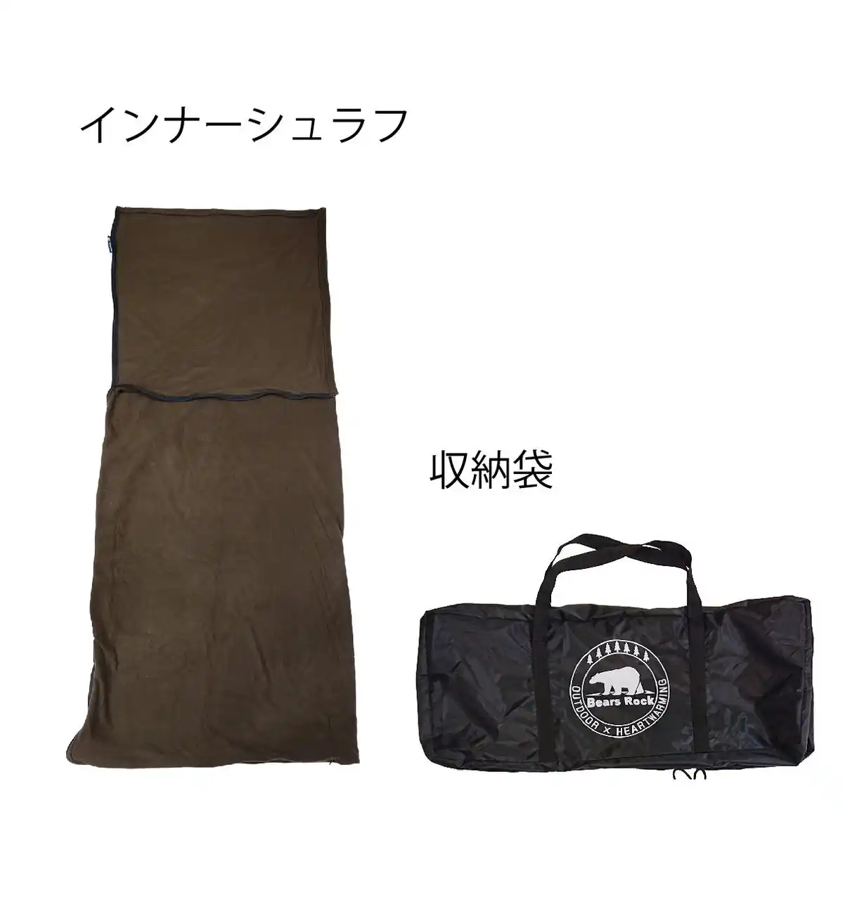 Bears Rockのロングセラー、冬用マミー型センタージッパー寝袋に、暖かいフリース素材のインナーシュラフと、さらに車中泊で役立つ用品を1つの袋に収めています。 |