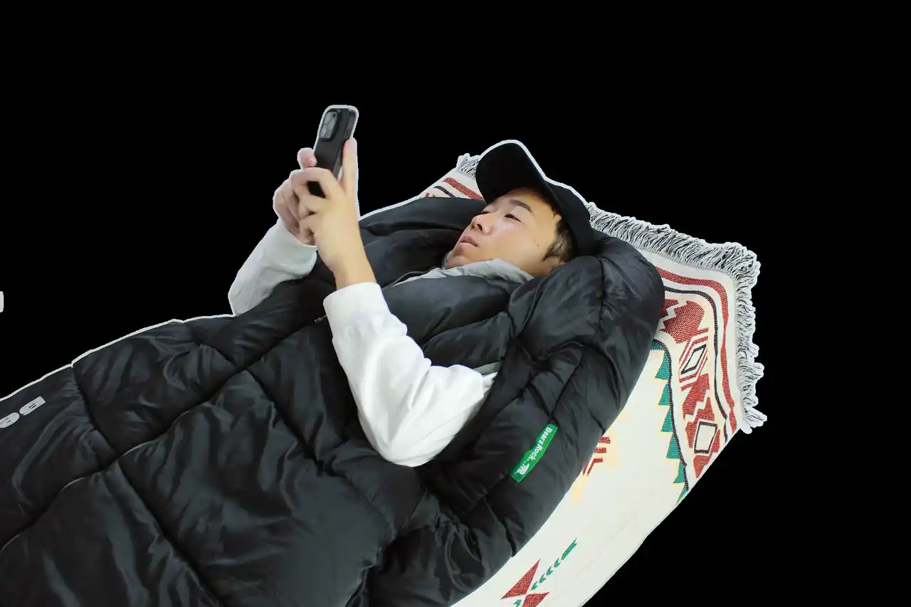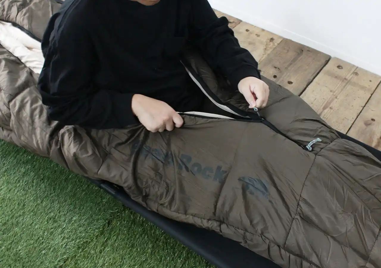 寝袋に入ったまま手だけを出せるファスナーを備え、飲み物を取ったりスマホを操作したりといった動作が可能。全開にする必要がないため、冷気を入れにくく、くつろぎ時間や就寝前も快適に過ごせます。 |