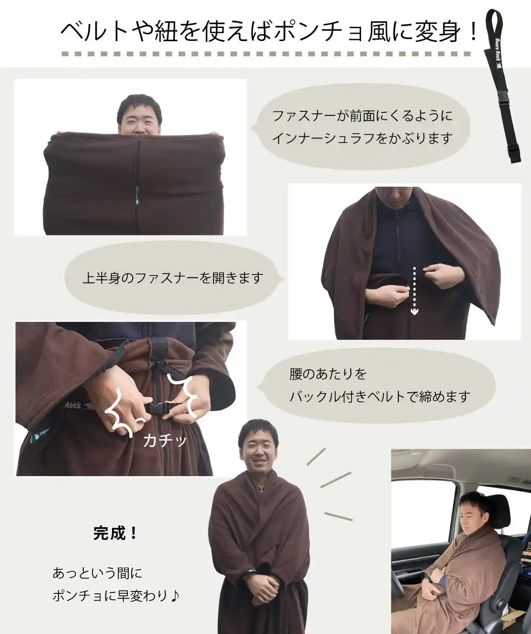 寝袋に入れて毛布のように使うことはもちろんですが、バックル付きベルトを使うことでポンチョ風にアレンジすることも可能!着たまま動くことができます。 |