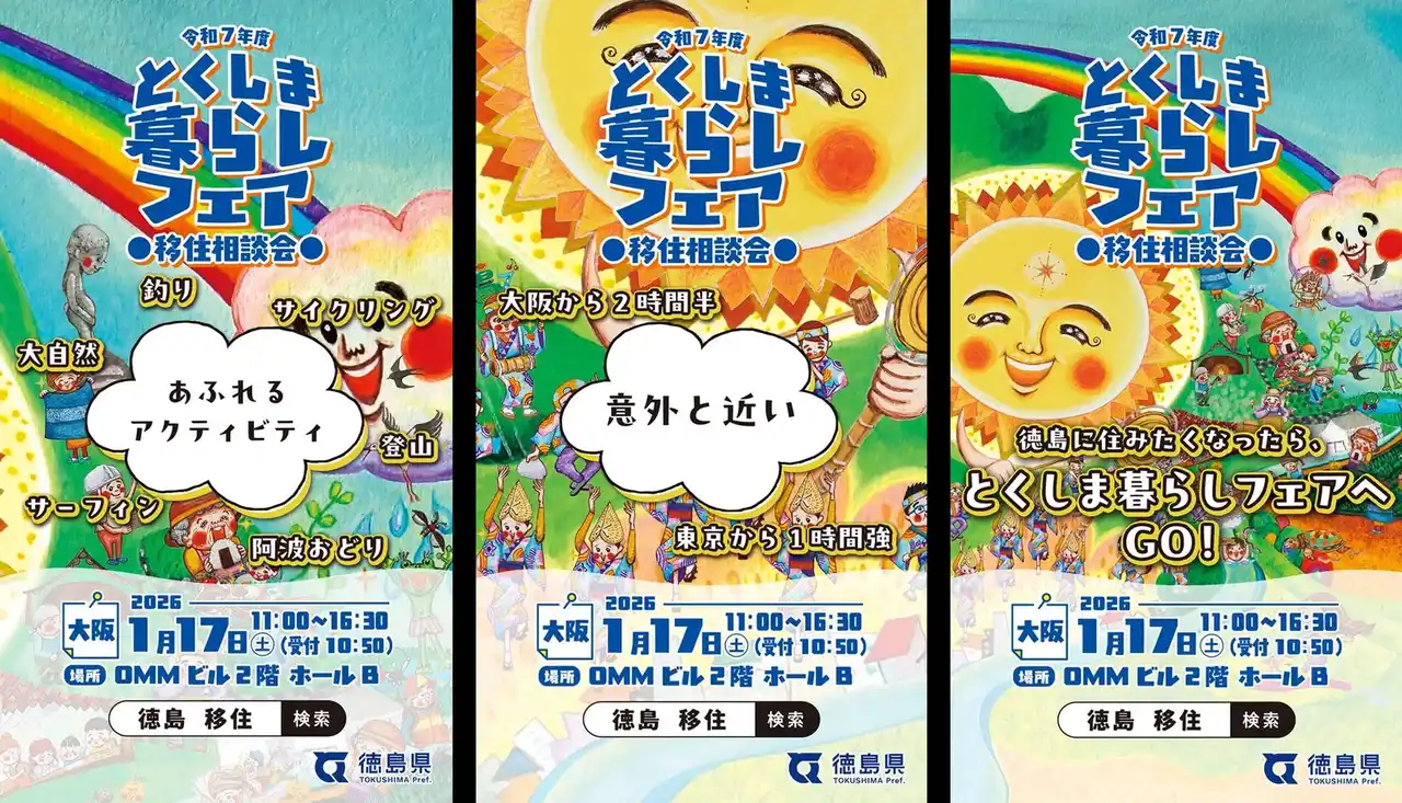 徳島県は、移住促進事業の一環として、2026年1月17日(土)に、大阪にて「とくしま暮らしフェア」を実施。該当フェア訴求のため、2026年1月4日(日)~1月18日(日)までの15日間、Osaka Metro御堂筋線・JR大阪駅を中心に複数媒体にて屋外広告を掲出します。 |