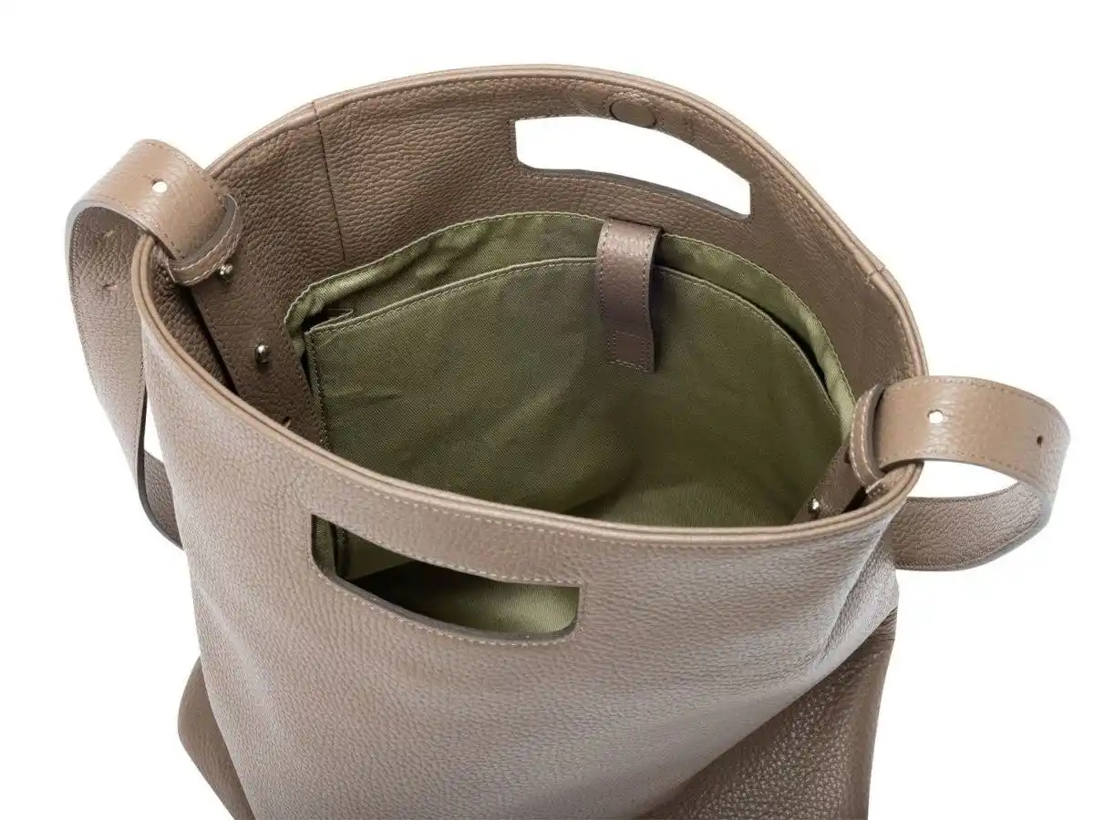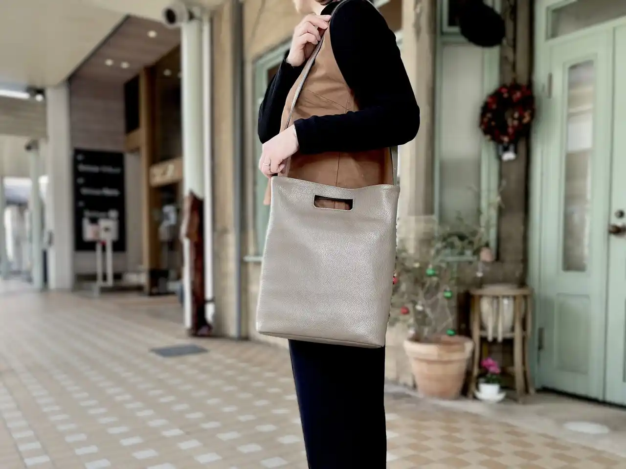 ●POINT2. 性別問わず様々なシーンで活躍できる上品なフォルム 手持ち、肩がけ、斜めがけができるように設計。 きれいめのファッションや、オフィスカジュアルにも合うシンプルデザイン。 |