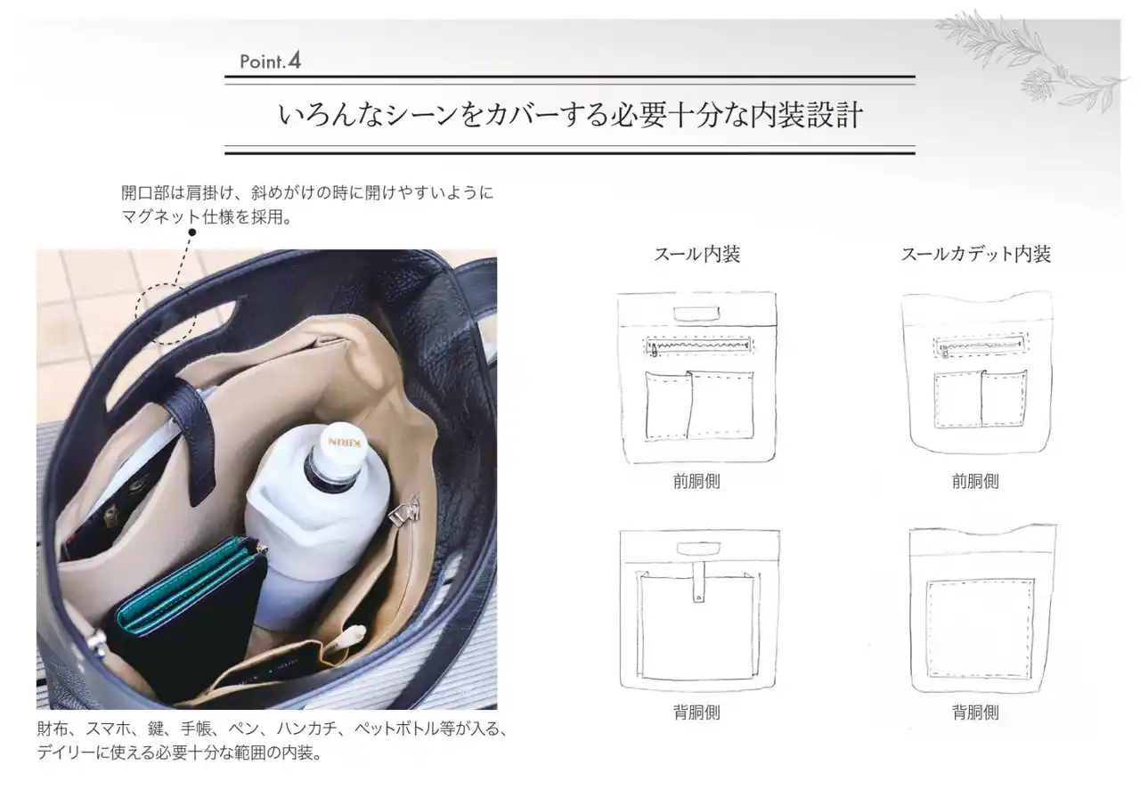 ●POINT4. オンオフどちらでも使いやすい必要十分な内装設計 開口部は肩掛け、斜めがけで持ちながら開けやすいようマグネットを採用。 |