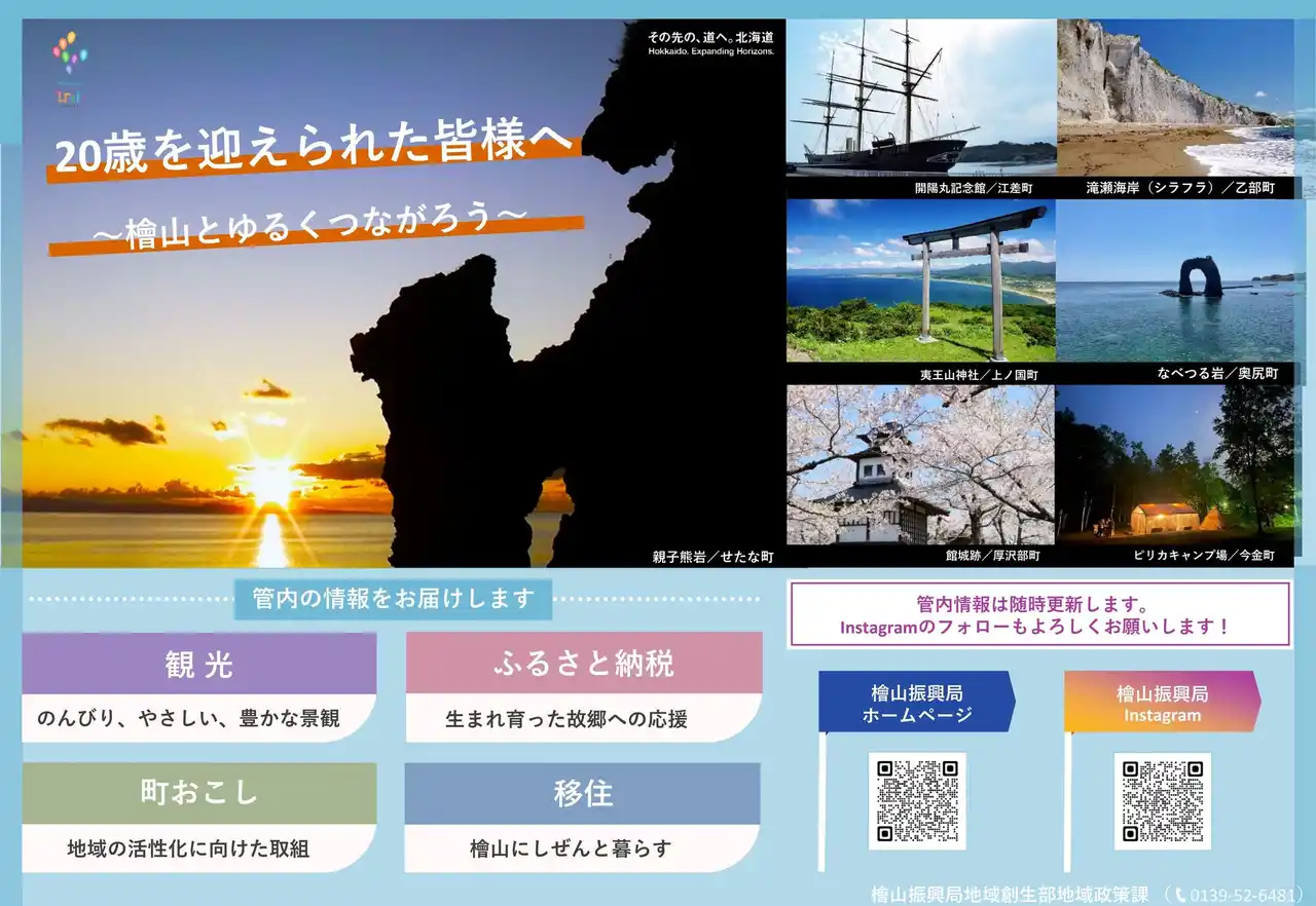 この度、檜山地域にゆかりのある方へ継続的な情報発信を行うきっかけとするため、管内町協力のもと、「管内出身で帰省している方」に向けた町広報誌での記事掲載と、「20歳の集い(旧成人式)に参加される方』に向けたチラシの配布を行います。 |