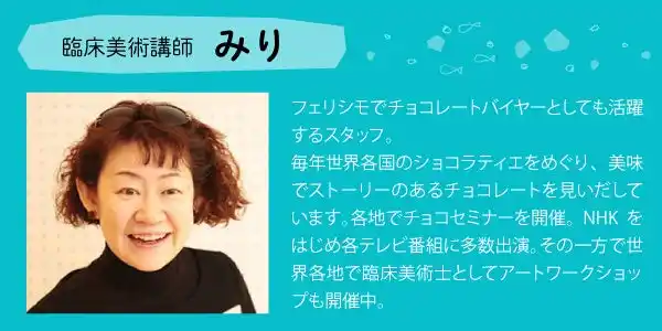 それぞれのプログラムでアートを制作して、その後はみなさんの作品を並べて鑑賞会を行います。作品の魅力に触れ、それぞれの個性や感性について、講師がひとつひとつコメントしていきます。うまい下手ではなく、お互いの作品を認め、一人ひとりの違いが美しく輝く心地よい時間を過ごしましょう。 |