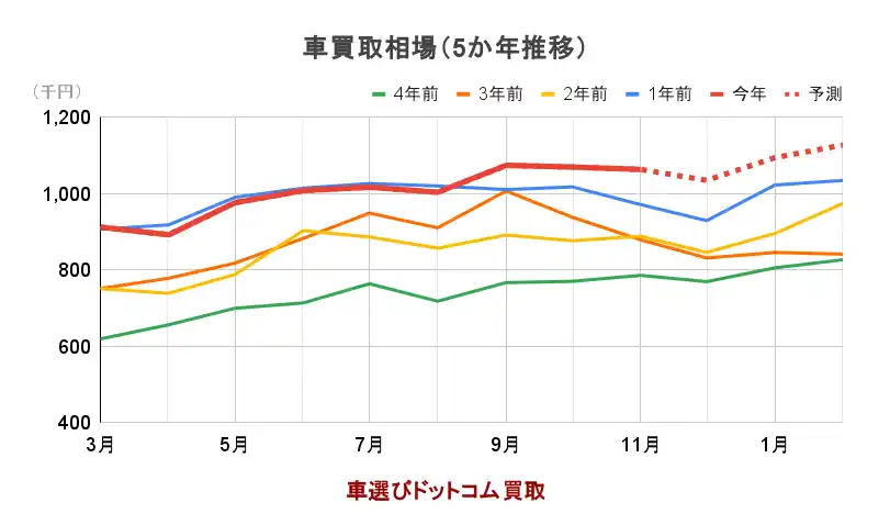 2025年の中古車買取相場は、年間を通じて高水準で推移しました。例年であれば一時的な調整局面を迎える夏場においても大きな下落は見られず、そのまま秋の需要期を迎えた結果、買取相場は前年を上回り、過去5年間で最高水準を記録しています。 |
