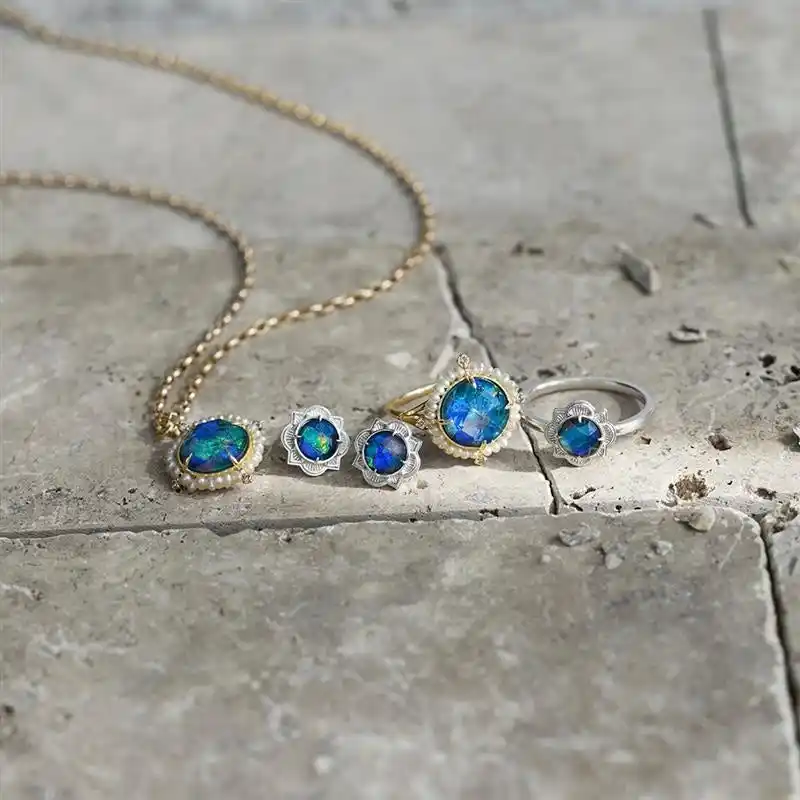 モザイクオパールの上にグリーンクォーツを貼り合わせ、ダブレットストーンに仕上げたシリーズ。 |