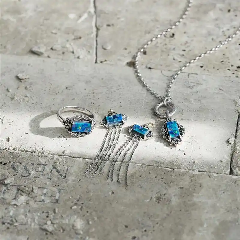天然のオパールのかけらを隙間なく敷き詰めたモザイクオパールは、それぞれの破片が異なる色彩を放ち、まるで1つの芸術作品のような唯一無二の輝き。 |