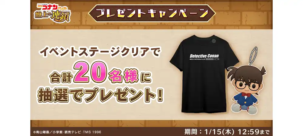 また、全ステージクリアで、「名探偵コナンパズルアクリルキーホルダー(江戸川コナンのぬいぐるみ)」や「BEIKA WATSONs CLUB非売品Tシャツ」が抽選で合計20名様に当たるプレゼントキャンペーンに応募できます。 |