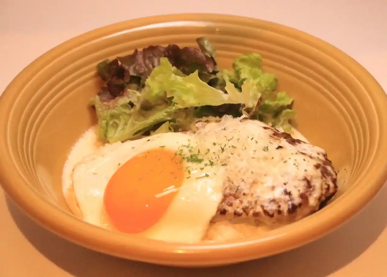 黄身の「隣で」「白雪」風ロコモコ丼 |