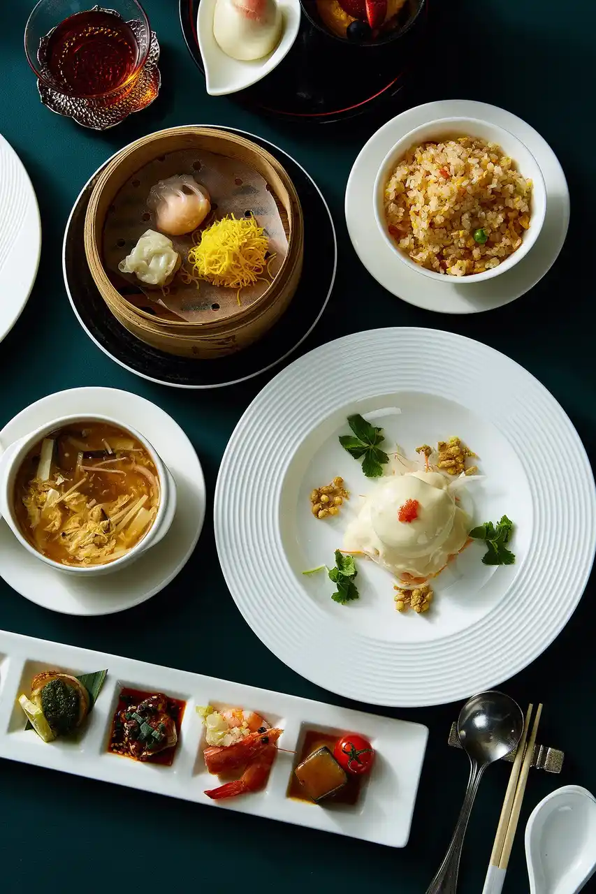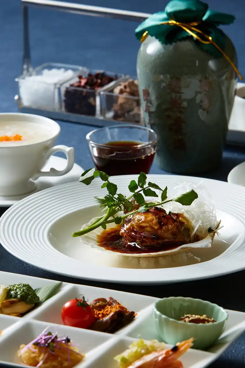・スープ ・選べる炒菜(若鶏のサンギ 鎮江黒酢仕立て / 北海道鱈と玉子のチリソース) ・メイン料理「北海帆立貝柱のヨーグルトソース仕立て」 ・飲茶3品盛り |