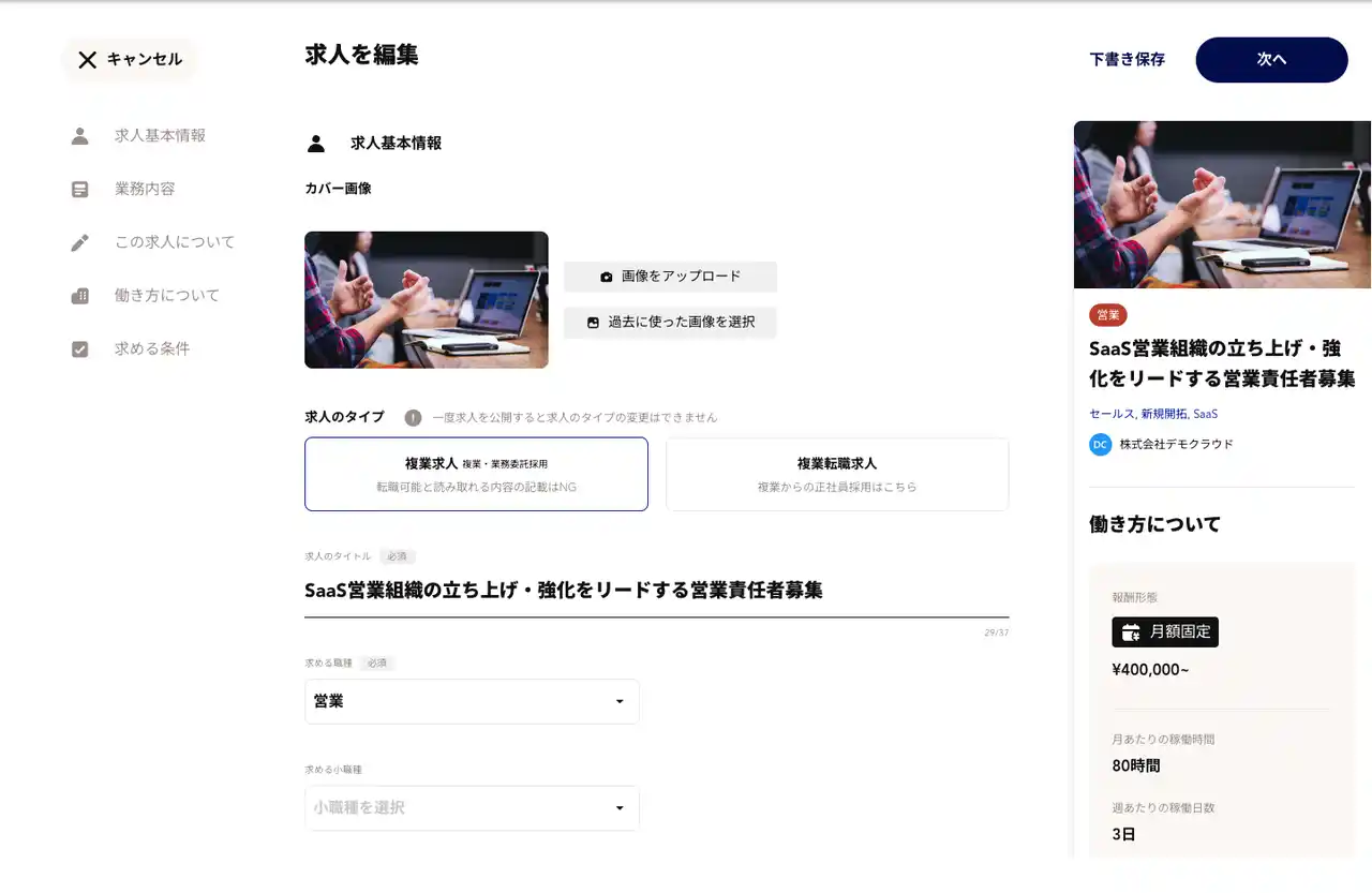 | 「複業クラウド」は複業したい個人と企業や自治体を繋ぐ、総合型複業マッチングプラットフォームです。複業を採用したい企業や自治体は、全職種・累計10万名以上の即戦力人材の中から気になるタレントに直接アプローチし、成果報酬無料のため何名でも自由に面談~採用することができます。2025年12月現在、大手企業からスタートアップ、スポーツチームまで累計2,500社、47都道府県250自治体以上が導入しています。 | |||||||||