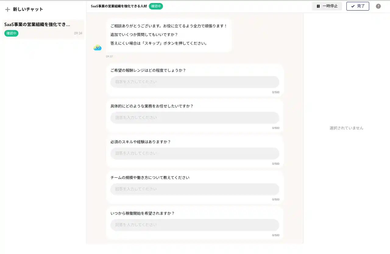 | 課題入力後のAI質問により、企業のニーズを深掘りし、意図に沿った人材を提案。 | |||||||||
