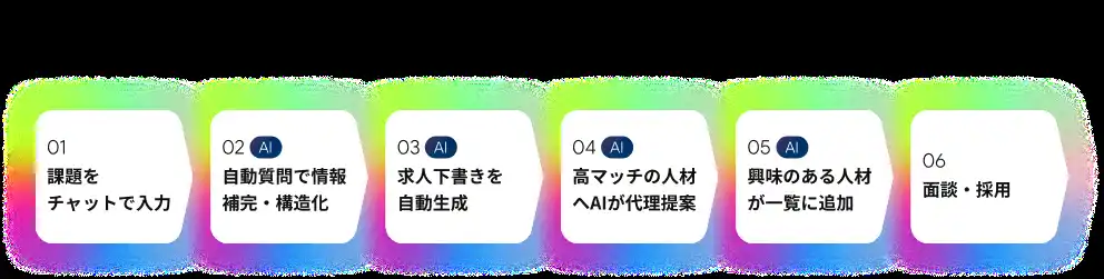 | AIが求人要件の整理・候補者選定を自動化。採用担当が不在でも活用可能。 | |||||||||