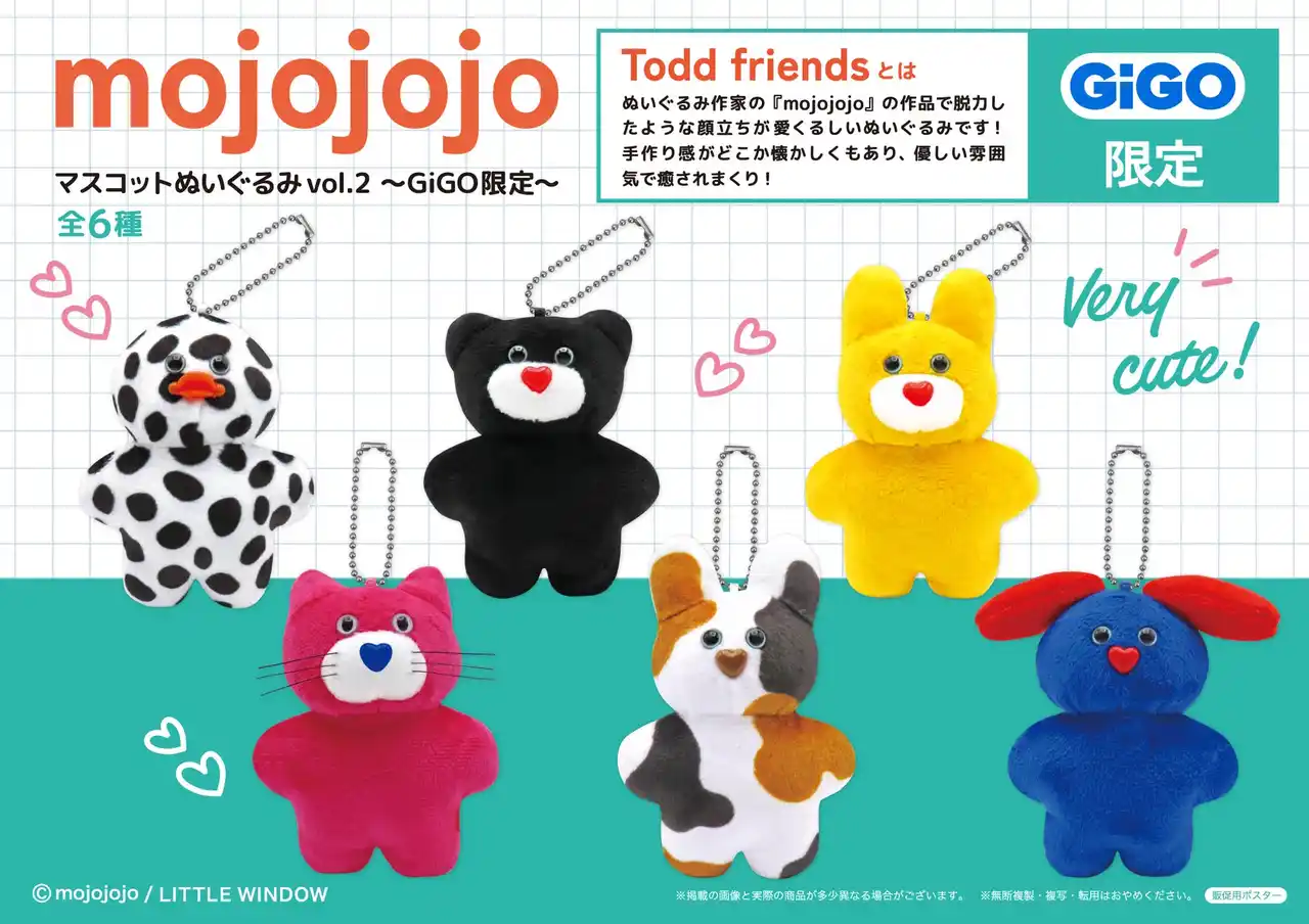 株式会社GENDA GiGO Entertainment(本社:東京都港区 代表取締役社長:二宮 一浩、以下「当社」)はGiGOグループのお店において、2026年1月22日(木)より、大人気のぬいぐるみ作家「mojojojo」が手掛ける脱力したような愛くるしい顔立ち、懐かしく優しい作りが特徴のマスコットぬいぐるみがGiGO限定アソートとなり連続的に登場いたします。 |
