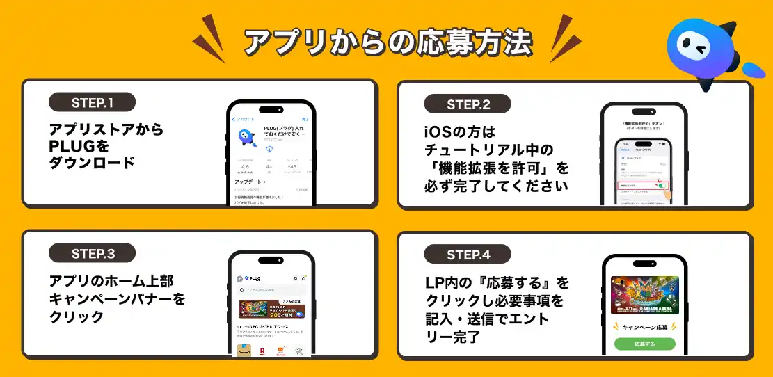 ※既に『PLUG』をインストール済みの方は、ステップ3・4の完了で応募可能です |