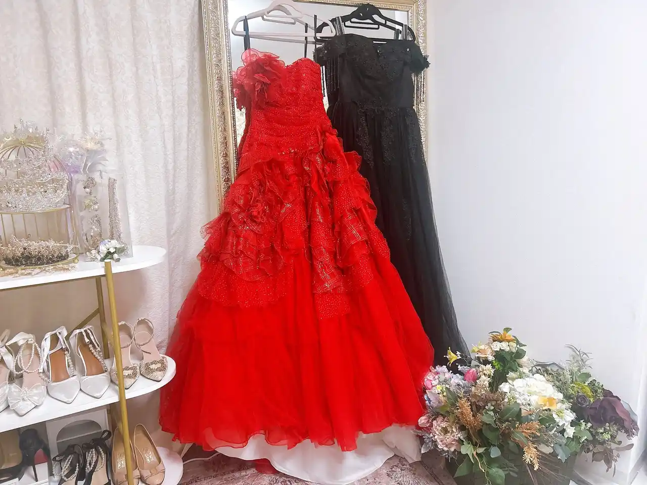 | 当スタジオは、お客様が鏡の前でドレスにお着替えする瞬間をとても大切にしています。 | |||||||||