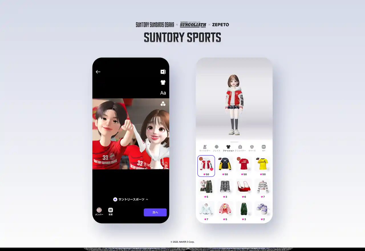 期間中にZEPETOにログインするだけで、サントリーサンバーズ大阪/東京サントリーサンゴリアスのユニフォームアイテムをボーナスとしてゲットできます。 |