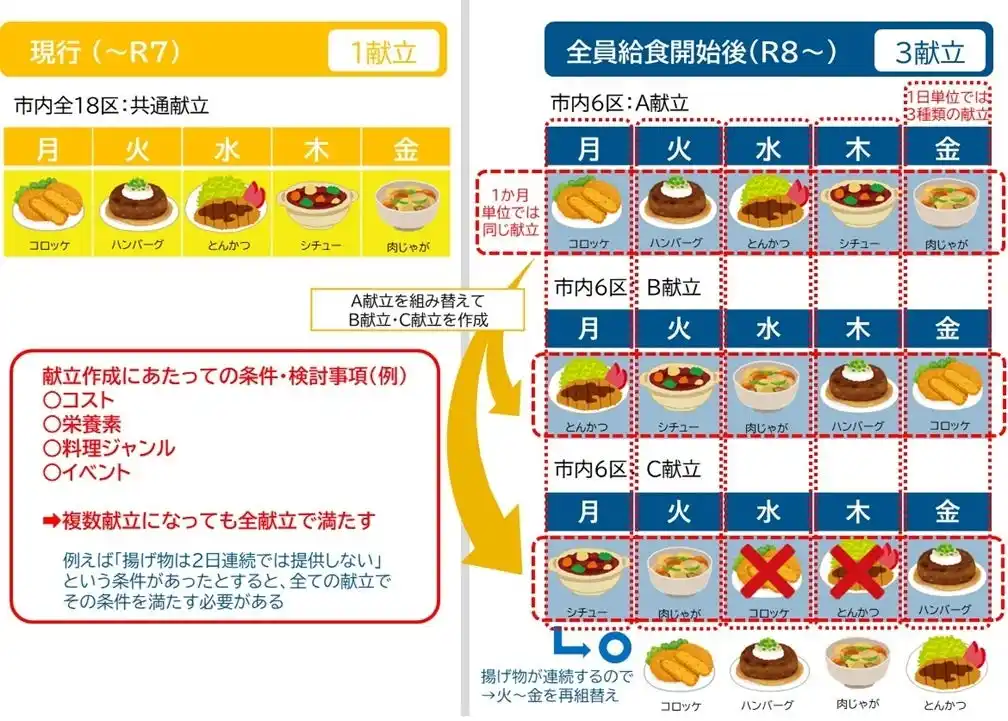 令和7年度までは1日あたり1献立(市内全域で同じ)ですが、全員給食が始まる令和8年度以降、給食提供数が約8万食へと大幅に増加するため、安定的に日々の食材を調達できるよう、1日あたり3献立(アレルギー代替食を含めると5献立)で給食を提供します※。 |