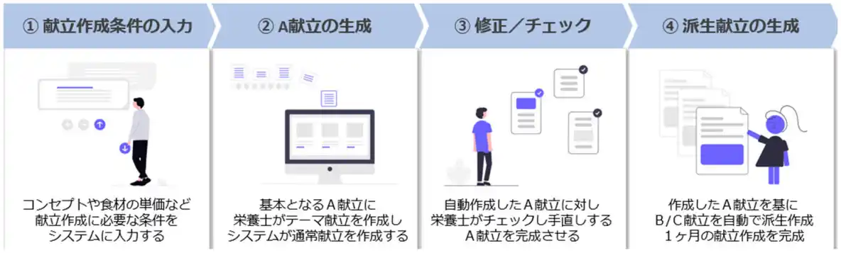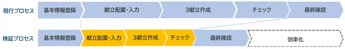 献立案作成後の確認工程が複雑であり、修正が発生すると関連箇所への影響が連鎖的に広がり、複数の修正対応が必要となる。その結果、全体の修正作業に時間を要するケースがある。 |