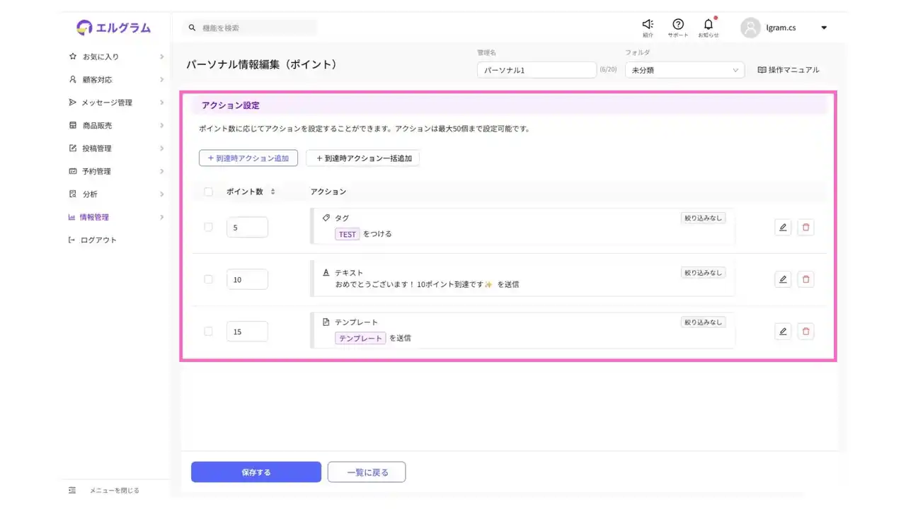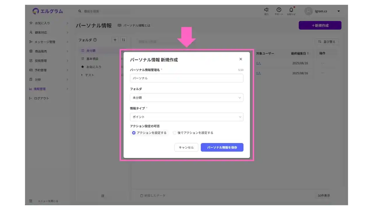 今回のアップデートでは、新規作成時にパーソナル情報の登録とあわせて、アクション設定の有無を選択できるようになりました。これにより設定の流れが分かりやすくなり、初期段階で必要な項目を整理しやすくなりました。 |